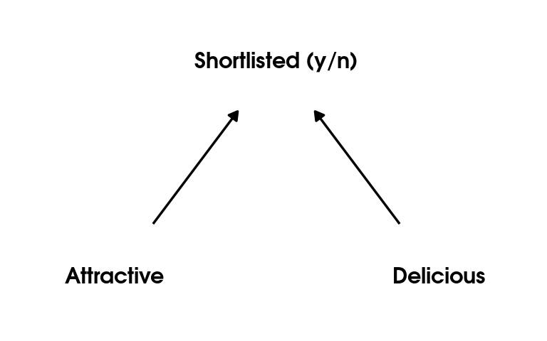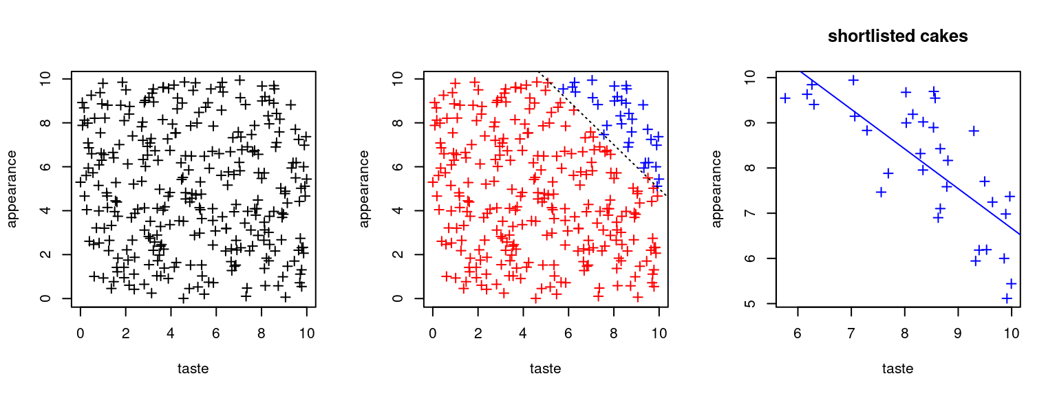 appearance and taste becomes negatively correlated once we condition our analysis on whether a cake was shortlisted or not.