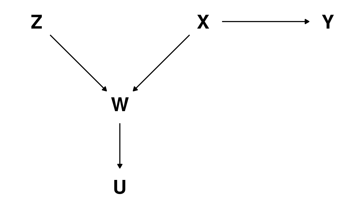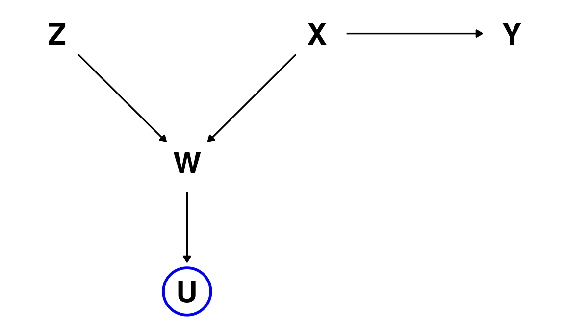 However, \(W\) is a collider node, so if we condition our analysis on \(W\) we would find a ‘spurious’ association between \(Z\) and \(Y\)