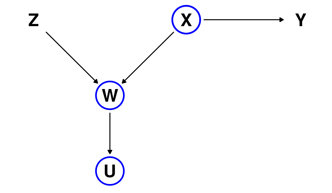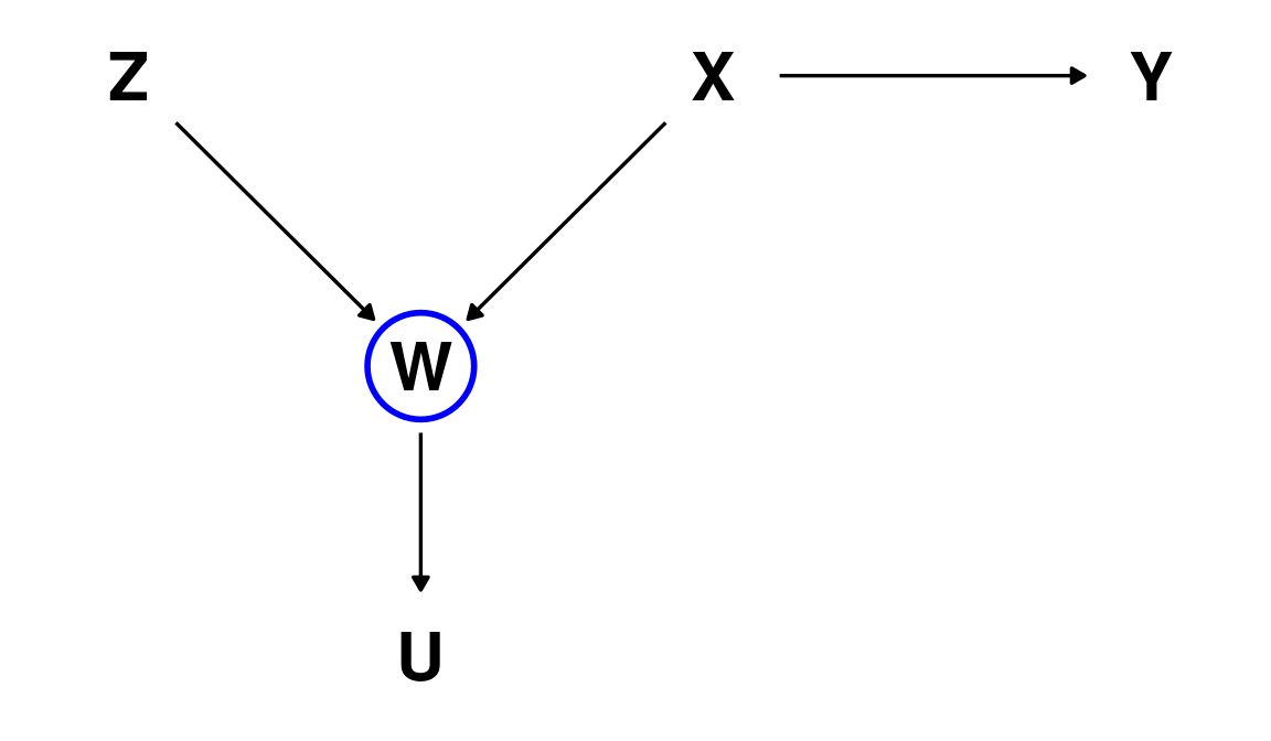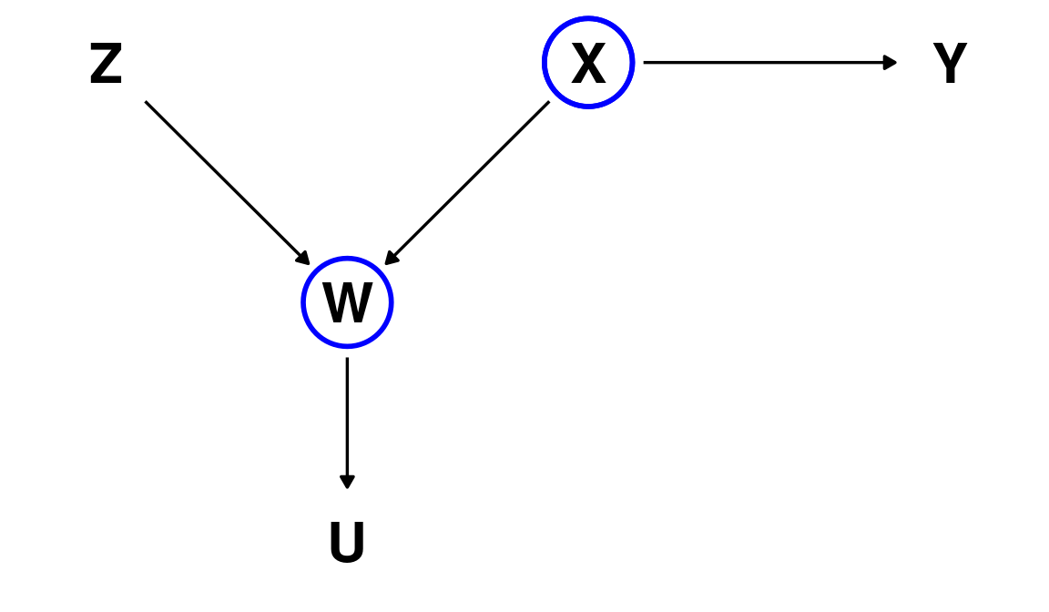 Conditioning on \(X\) makes \(Z_1\) and \(W\) independent one another (\(W \perp\!\!\!\perp Z_1 \mid X\)); all other paths are “blocked” by a collider.
