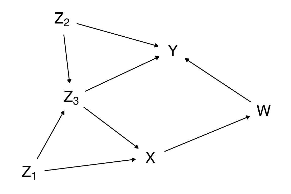 This implies that if we regress \(W\) on \(X\) and \(Z_1\), e.g. \[W = \beta_1 X + \beta_2 Z_1\]