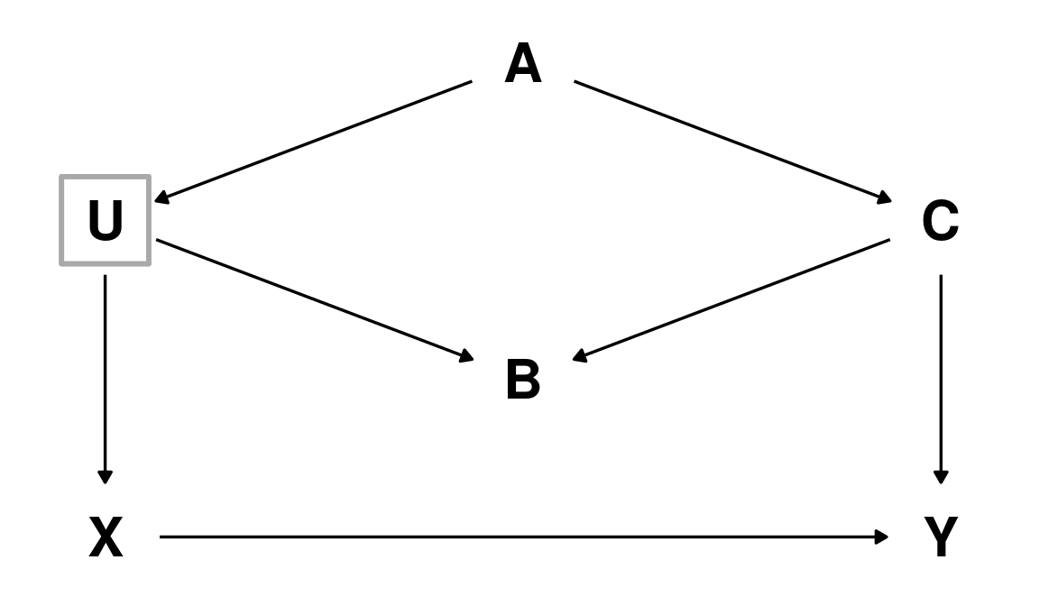 Path (2) is already blocked by a collider in \(B\). Path (1) needs to be blocked; we can’t condition on \(U\) since is not observed, so this leaves us either \(A\) or \(C\) (either will suffice).